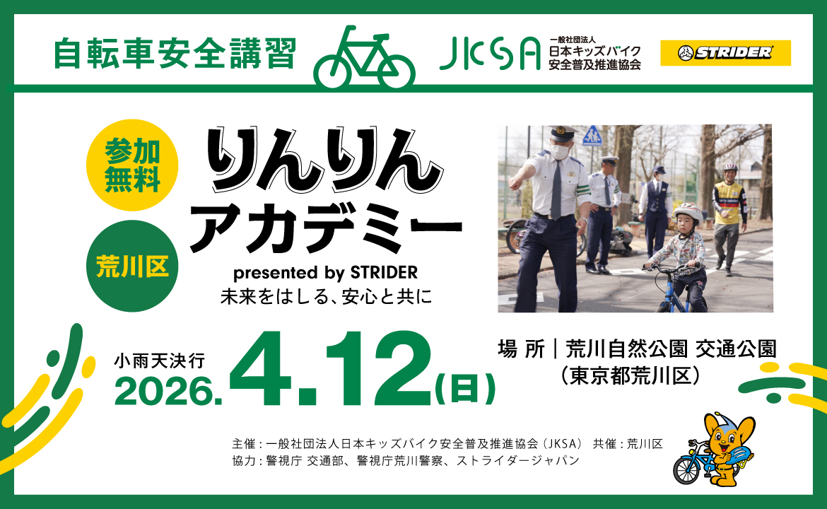 お子様向けの『自転車安全講習りんりんアカデミー presented by STRIDER』を東京都荒川区で開催します。